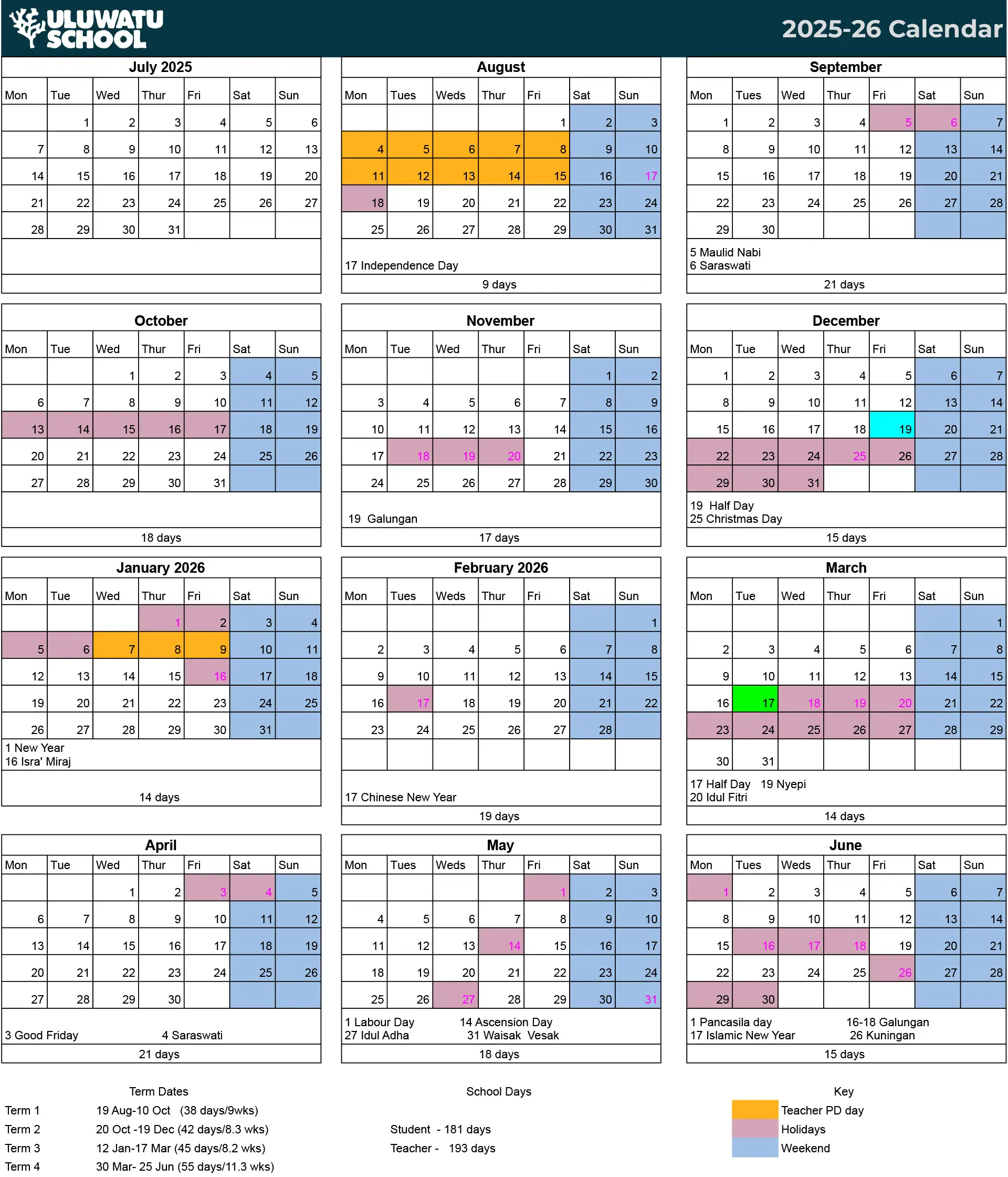 The Uluwatu School calendar is reviewed annually and communicated to families prior to the start of each academic year. Any updates or changes are shared promptly through official school communication channels.